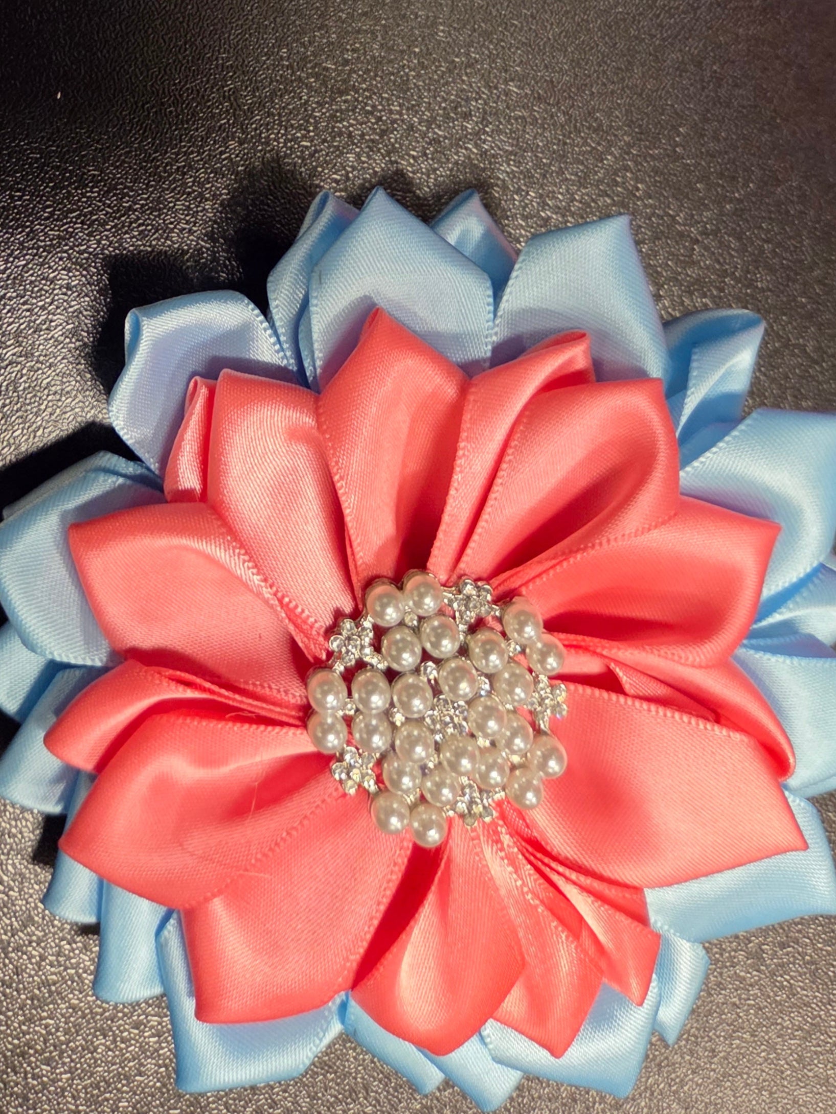 Bright, bold, and beautiful — this Pink & Sky Satin Flower Brooch adds a fun pop of color to any outfit. Featuring layered petals of vibrant coral satin paired with a soft sky-blue base, this accessory creates a striking contrast that radiates charm. The centerpiece sparkles with a cluster of pearls and rhinestones, giving the flower a touch of elegance that balances its playful hues.