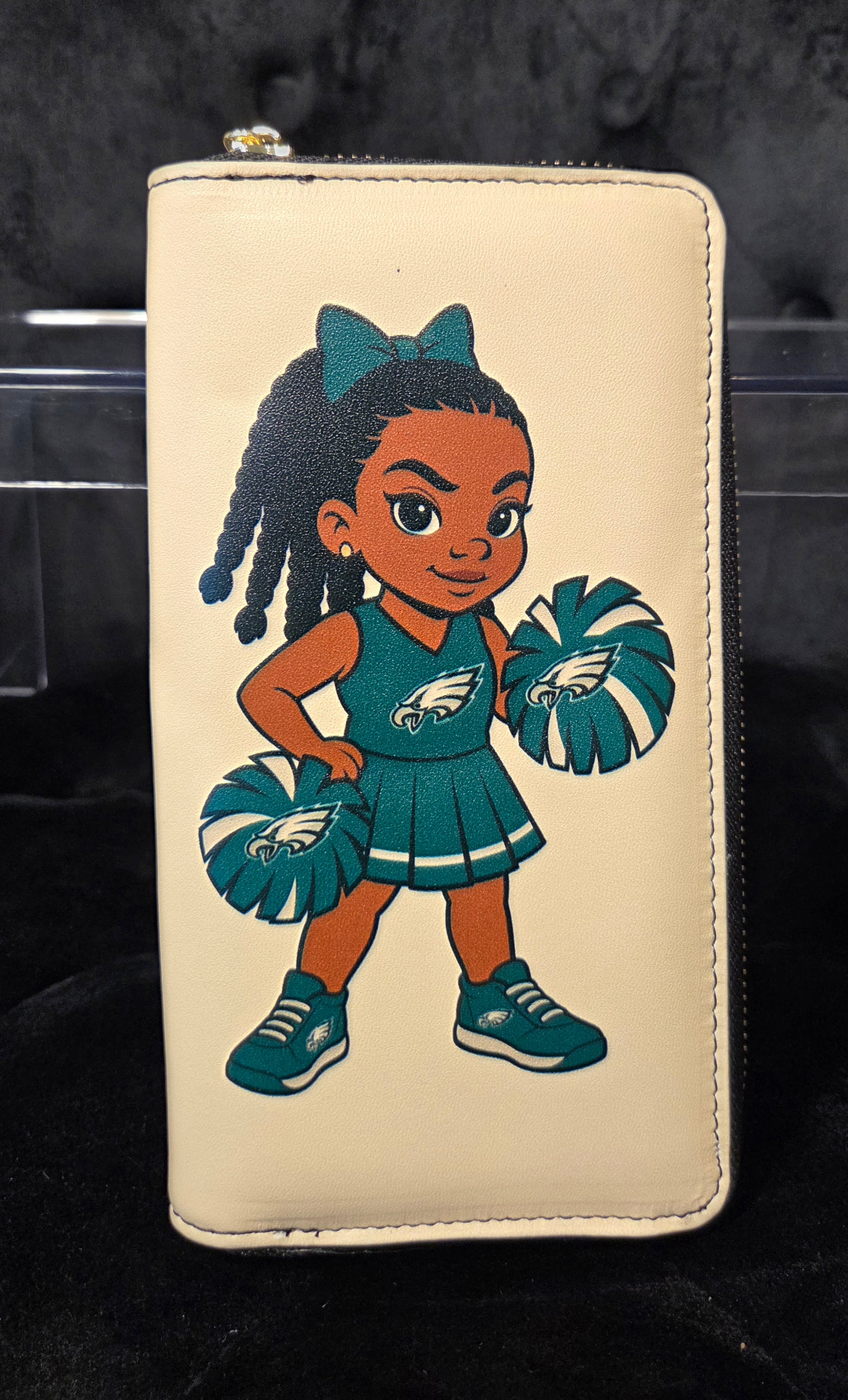 Carry your essentials with spirit and style! This slim faux leather wallet features a vibrant cheerleader graphic in teal and white, inspired by Philadelphia team colors. With space for up to 6 credit or ID cards, this compact wallet is perfect for minimalist carry while still making a bold, sporty fashion statement.