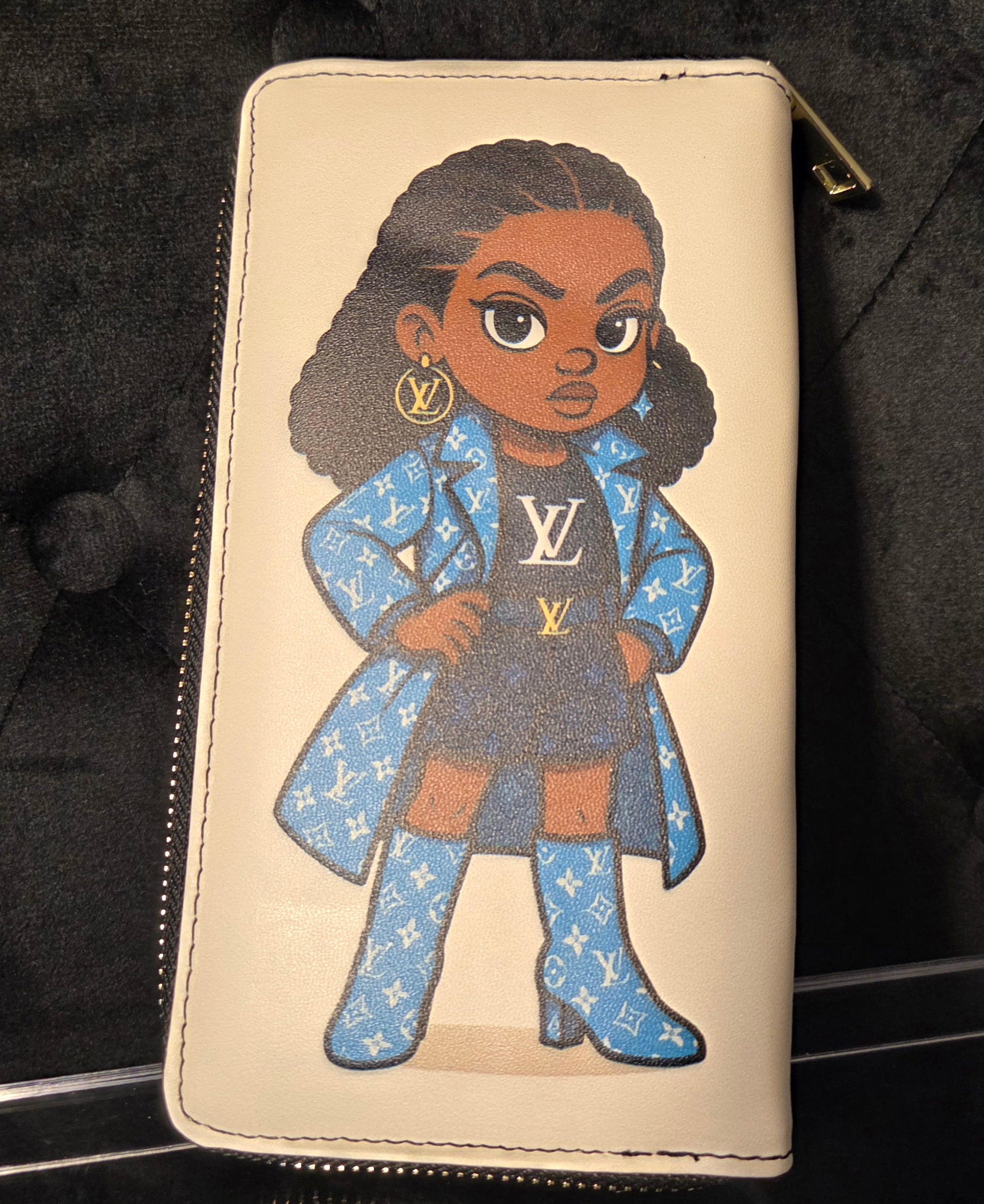 Carry a touch of glam with this 6-card faux leather wallet, styled with a bold blue luxury-inspired outfit graphic. Featuring a confident cartoon fashion girl in matching coat, boots, and accessories, this compact wallet brings designer energy in a small, grab-and-go size.