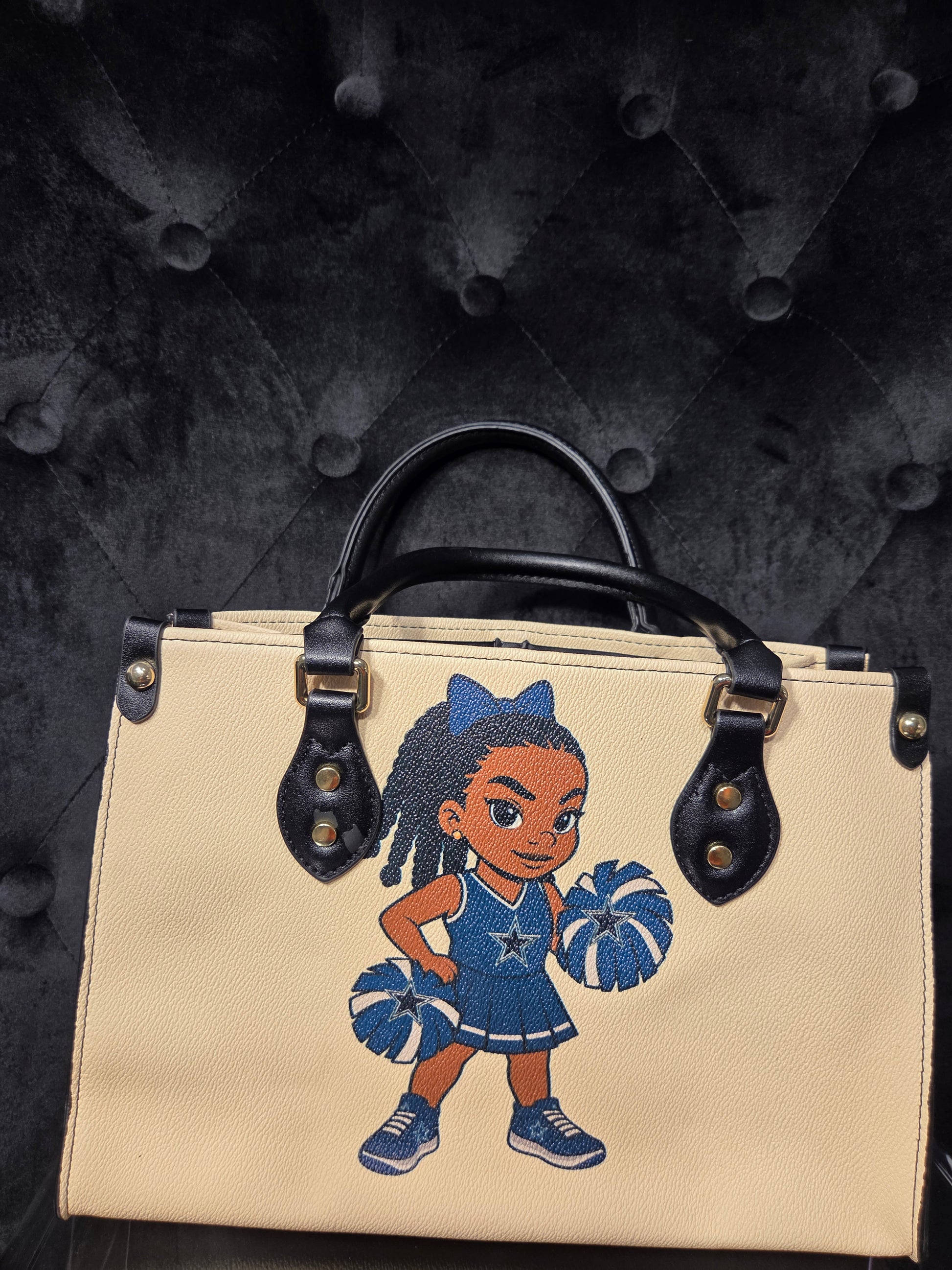 Carry team pride in style with this cheer-inspired faux leather handbag, featuring a confident cheer girl in blue and white game-day gear — complete with matching bow, sneakers, and pom-poms. With durable black handles, gold-tone accents, and a smooth cream finish, this bag blends sporty spirit with boutique fashion flair.