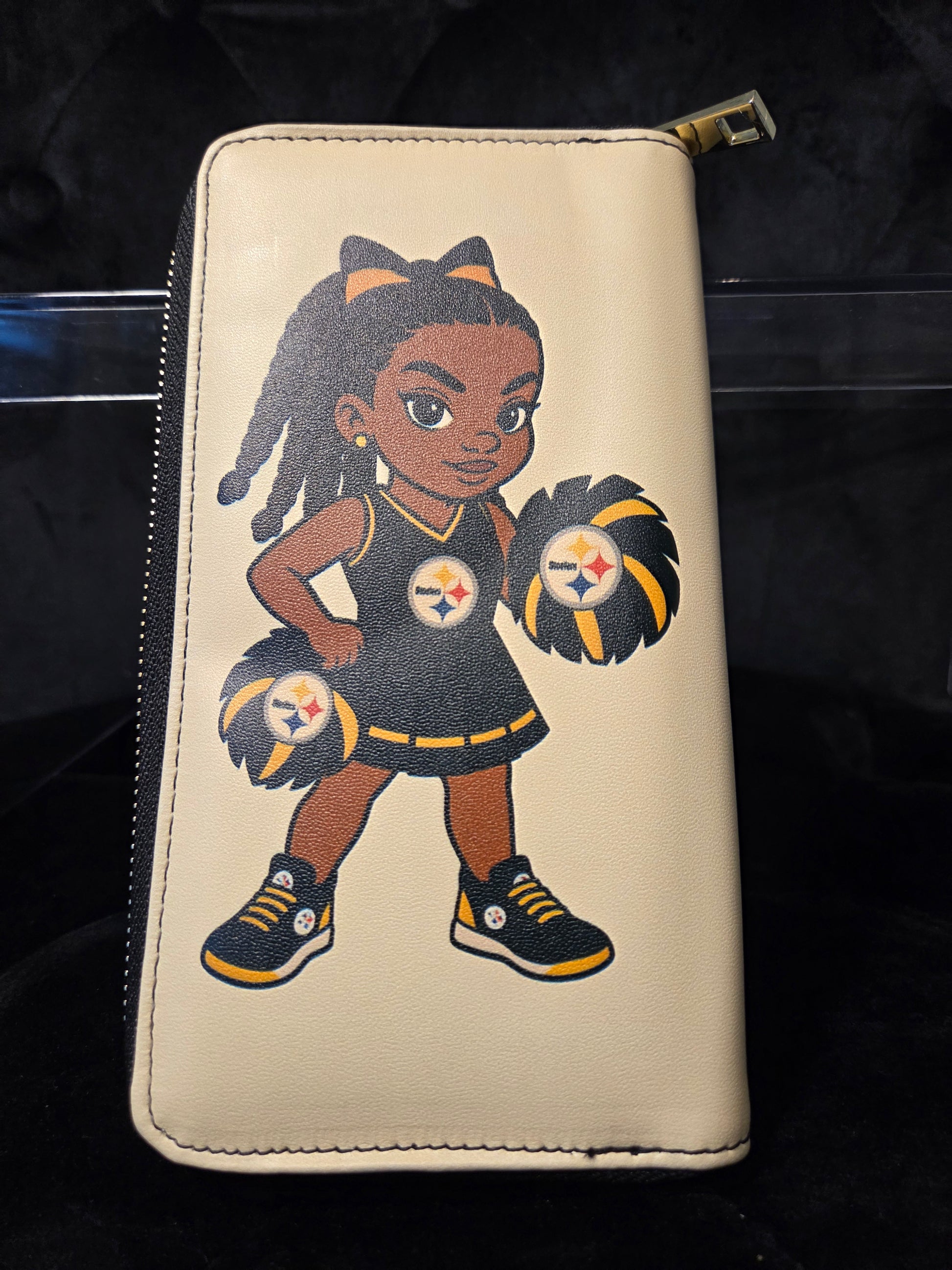 Bring your fan spirit everywhere you go with this bold black and gold cheer girl zip wallet! Featuring a fierce cartoon cheerleader in full game-day gear — complete with team-colored bow, pom-poms, sneakers, and confident attitude — this wallet delivers style, spirit, and sass all in one.
