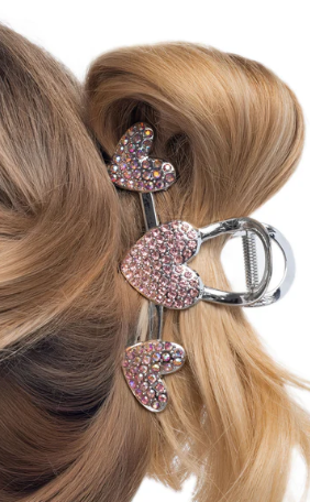 Featuring light rose and light rose iridescent rhinestones, a trio of silver hearts in varying sizes curls atop both sides of a glistening silver claw clip, holding the hair away from the face for an on-the-go heartfelt display. Clip measures approximately 4 1/2" in length and 2 1/4" in width. Due to its prismatic palette, color may vary.